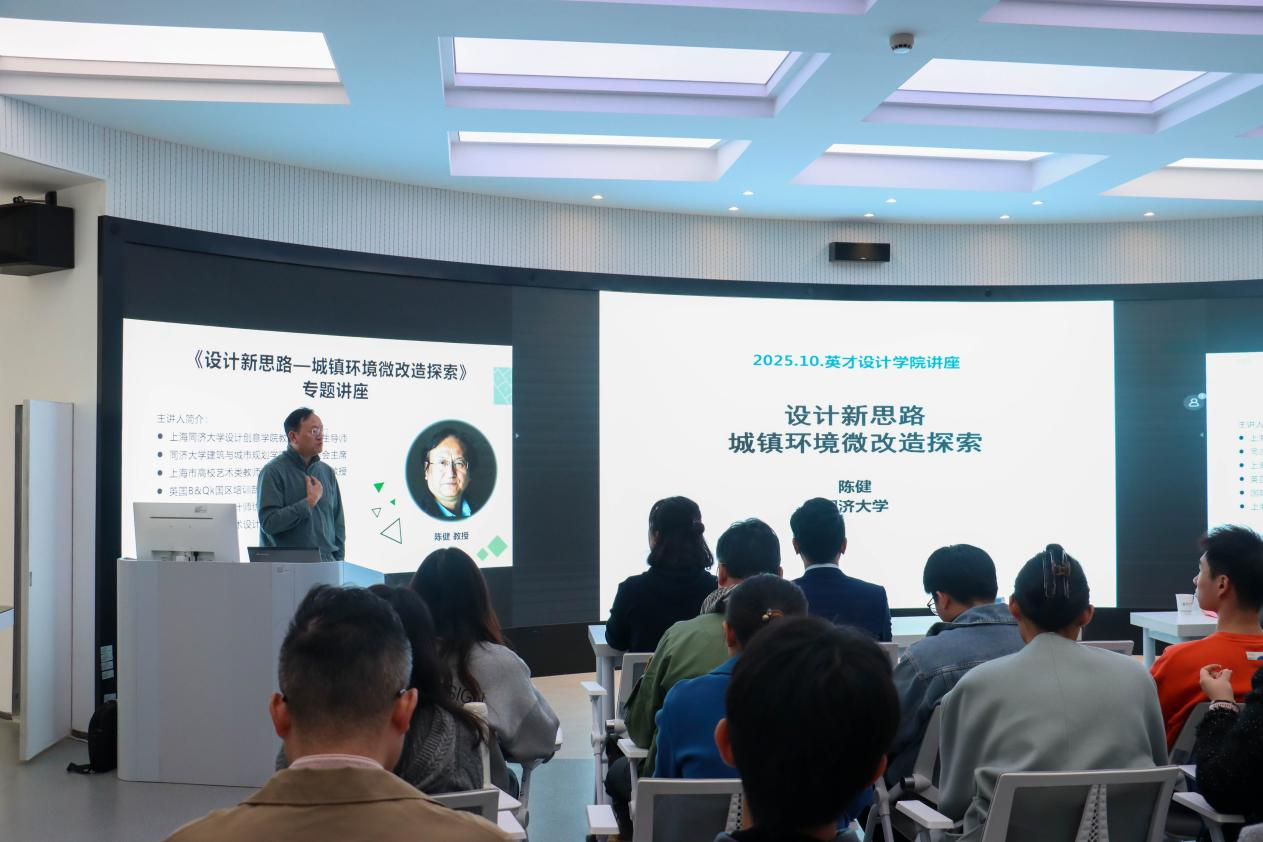 2025年10月27日,设计学院主办的“设计新思路:城镇环境微改造探索”专题讲座在学院报告厅成功举行。本次活动特邀上海同济大学知名学者陈健教授担任主讲嘉宾,旨在深入探讨城镇环境微更新的前沿理念与实践经验,为师生带来一场学术与思想盛宴。活动吸引了众多师生踊跃参与,现场气氛热烈。