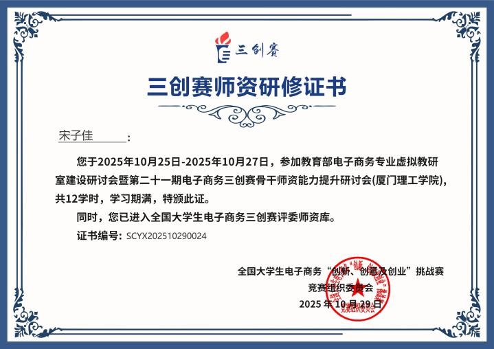 近日,第二十一期电子商务“三创赛”骨干师资能力提升研讨会在厦门成功举办。我校商学院(国际学院)宋子佳老师作为骨干师资代表受邀参会,与来自全国百余所高校的专家学者、行业精英齐聚一堂,围绕电子商务专业建设、三创赛制革新与产教深度融合等核心议题进行了深入交流与研讨。
