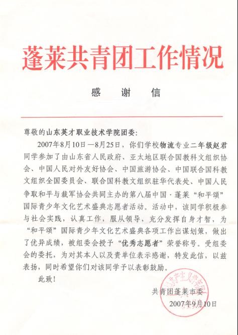 2007年9月10日,共青团蓬莱市委向我院发来感谢信,对赵君同学在活动期间的服务表示感谢。鉴于赵君同学的优秀表现,学院团委决定,授予赵君同学“2007年院级优秀志愿者”称号。