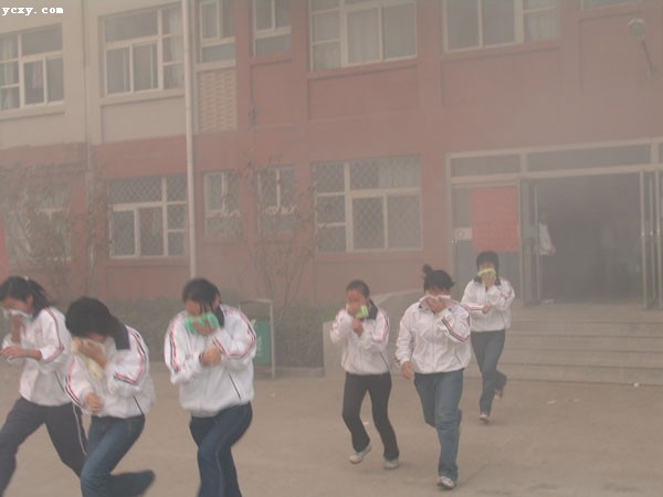 消防演习现场,学生进行“疏散逃生”
